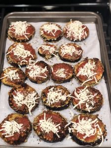 We had thinly sliced eggplant, then one shallow dish filled with a whisked egg, with himalayan salt and ground black pepper. Next to that was another shallow dish of panko, grated parmesan, garlic powder, and adobo. Basically, you start by dipping the eggplant into the egg combo, then the panko mix, then straight to the cast iron skillet. Cook each side of eggplant about 3 to 4 minutes. This process is what makes the pizzas super crispy.